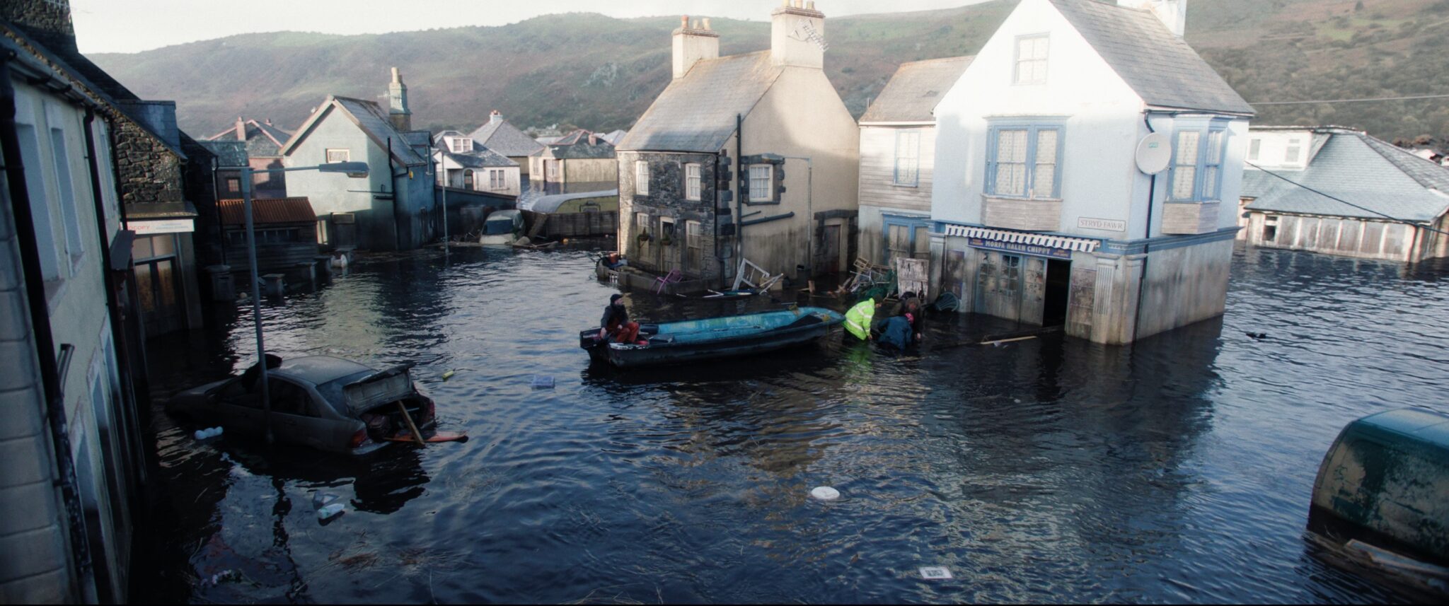 The work began with concept designs for drone shots showing the town of Morfa Halen before and after the flooding. These were developed into digital matte paintings using a lidar scan of the real town as a base, before moving into compositing where the environments were carefully integrated into the drone-shot plates.