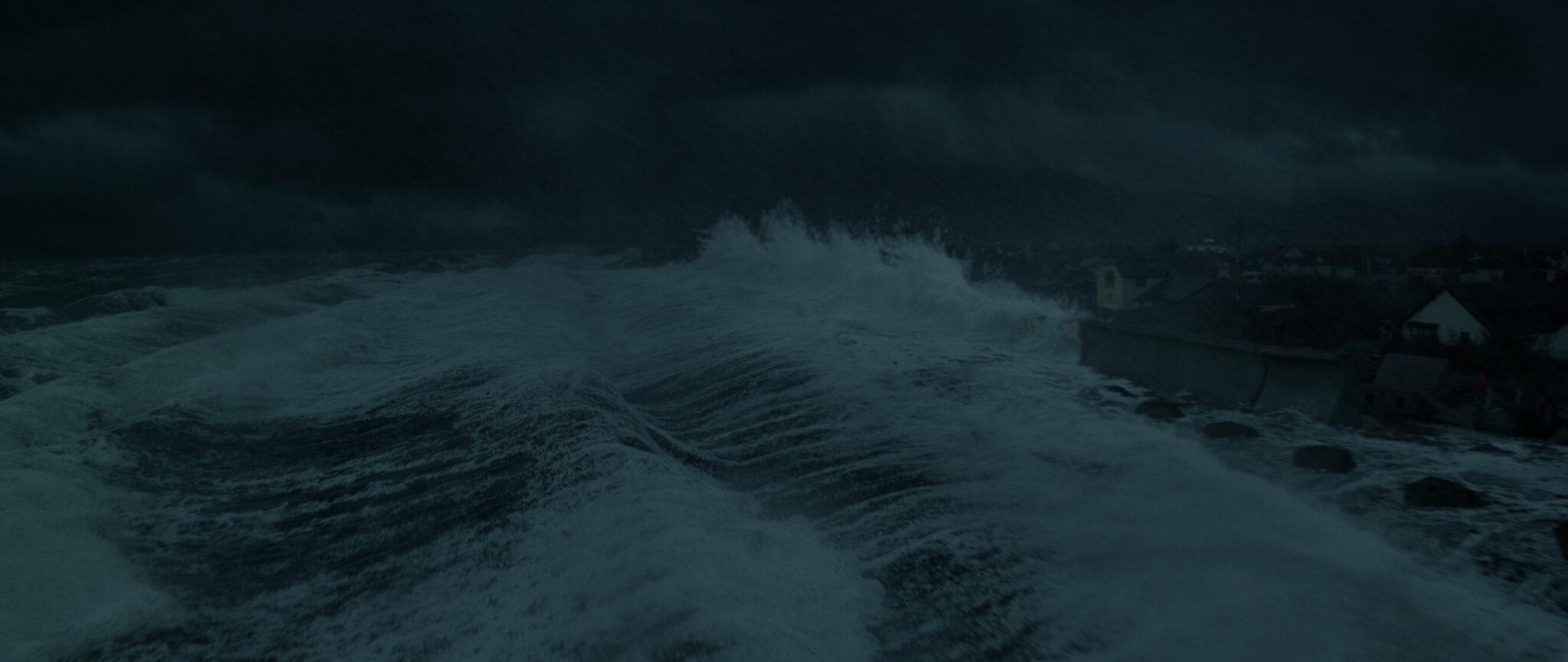 The storm reaches its peak in Episode 5, as rising water threatens to breach the seawall. Much of this sequence had been shot in fine, sunny conditions, requiring extensive sky replacements, added rain, atmospherics and rough water to sell the intensity of the storm. Stormy seas and skies were added throughout Episodes 5 and 6, alongside large amounts of rain work and, in some cases, snow.